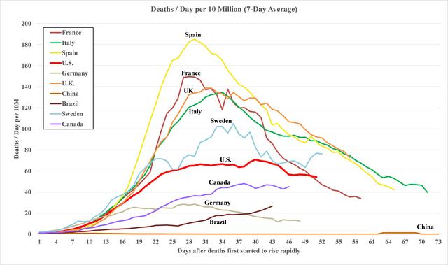 3) The last chart is the same analysis, but now comparing the U.S. to nine other countries: five very hard-hit ones (France, Italy, Spain, and the U.K.), four less hard-hit (Germany, Sweden, Canada, and China), and one with a rapidly expanding crisis (Brazil):