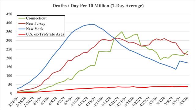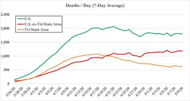 1) This first chart shows COVID-19 deaths per day (trailing seven-day average) for the U.S., the tri-state area (New York, New Jersey, and Connecticut), and the U.S. ex the tri-state area. It reveals that, while the U.S. has shown a slight decline overall, this is entirely due to a meaningful decline in the tri-state area. Excluding this, daily deaths are still rising across the other 47 states: