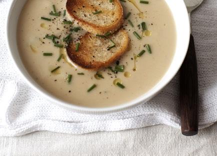 Meanwhile, bring chicken stock to the boil in a saucepan. Add to blender and blend until smooth. Add crème fraîche, season to taste, then serve topped with chopped chives and toasted baguette and drizzled with extra-virgin olive oil.