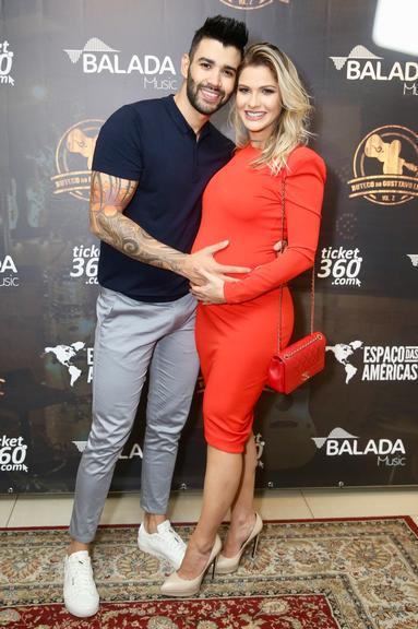 Andressa Suita marcou presença na estreia da nova turnê de seu marido, o cantor Gusttavo Lima. No camarim, os dois trocaram beijos e carinhos enquanto posavam para as fotos. Com um vestido vermelho, ela exibiu a sua barriguinha de seis meses de gestação do segundo filho, Samuel.