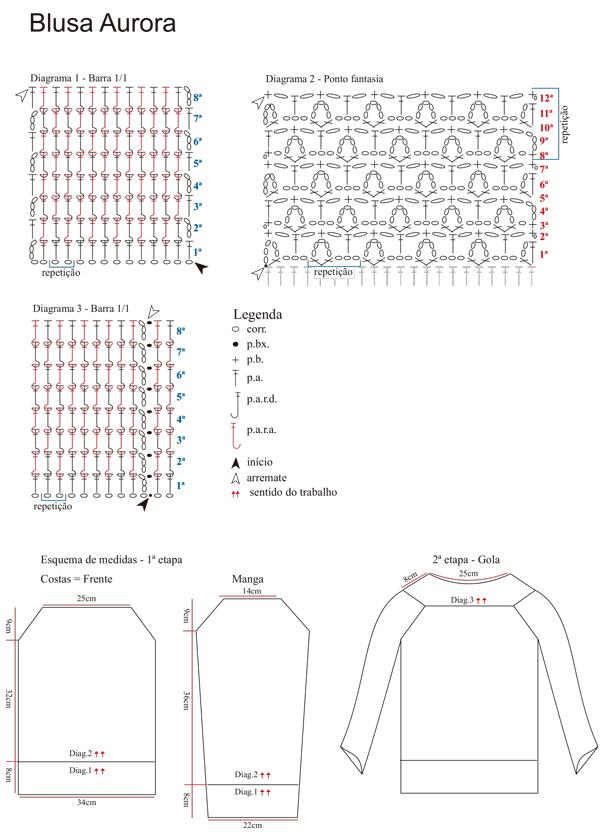 Abreviaturas – p.: ponto, pts.: pontos, nov.: novelo, carr.: carreira, ag.: agulha, , trab.: trabalhe ou trabalhando, diag.: diagrama, rep.: repetição.