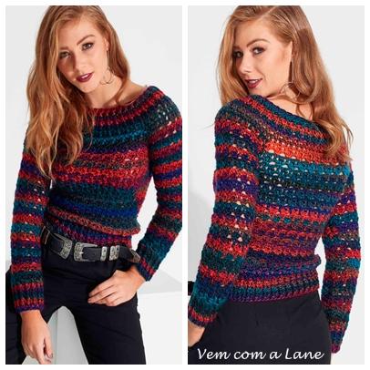Montagem e acabamento – Use a ag. de tapeçaria e o fio Boreal na cor mescla e una as la erais da peça (40cm). Una as mangas nas cavas (9cm) e feche as mangas. 2ª etapa – Retorne para a ag. de crochê de 5,0mm e trab. ao redor do decote a gola no p. de barra 1/1 acompanhando o diag. 3 e o p. de rep. da 1ª até a 8ª carr.. Trab. em carr. circulares e feche cada carr. com 1 p.bx.. Arremate o fio.
