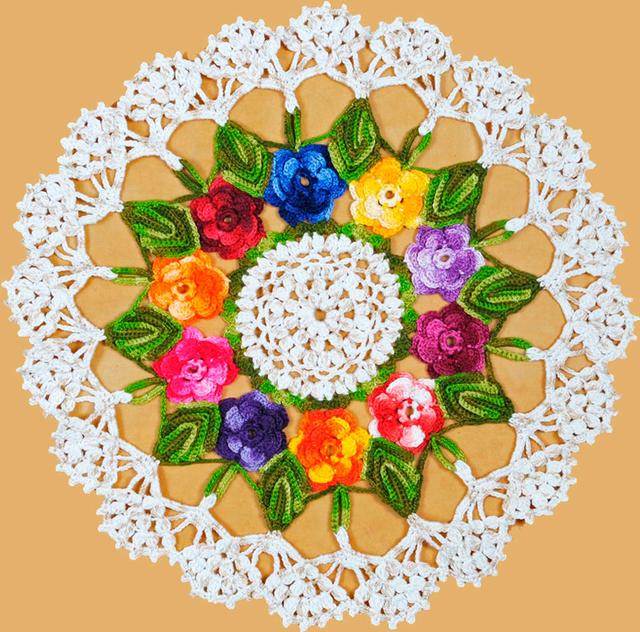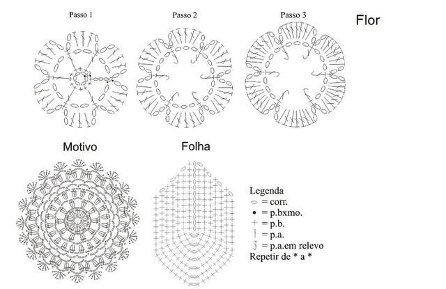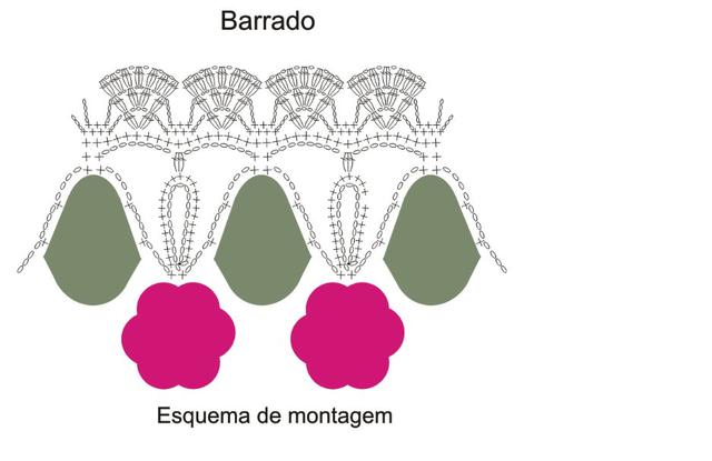 Folhas – Com o fio verde faça uma corr. De 12 p. mais uma corr. para virar e trabalhe seguindo o gráfico, pegando o p. só na alça de trás da corr. anterior. Una as folhas as flores com p. durante a última carr. seguindo o esquema de montagem. Terminando todas as folhas ainda com o fio verde faça a 1ª carr. do barrado seguindo o gráfico. Continue o barrado com o fio cru.