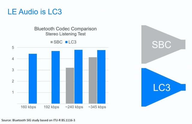 Perhaps the most significant component of LE Audio is LC3, a new low-complexity communication codec that promises to outperform classic Bluetooth audio at lower bitrates. Whereas the older sub-band codec (SBC) compressed a 1.5MBps, 48KHz stream to 345Kbps, the Bluetooth SIG says, LC3 can compress the same 1.5Mbps data into perceptibly better-sounding audio at only 192Kbps.