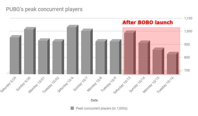Here is how the last four days compare to the same periods from the previous two weeks. Surprisingly, PUBG didn’t lose an abnormal amount of momentum on the Saturday and Sunday after BOBO debuted. This past weekend’s average peak concurrent player count is down 6.5 percent from the previous Saturday-Sunday period. The game has seen similar drops in the past.