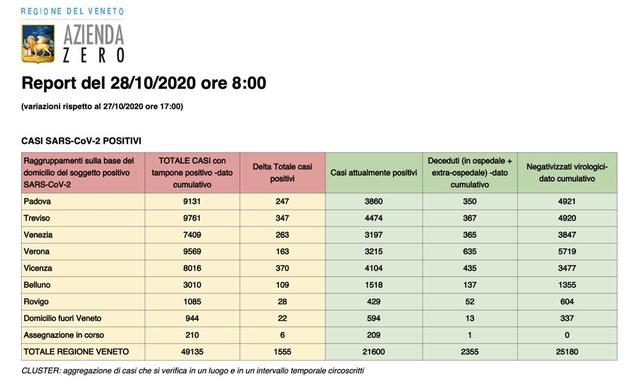 Secondo il bollettino fornito dalla Regione Veneto con i dati aggiornati alle ore 8 di questa mattina, mercoledì 28 ottobre, il numero di casi di tampone positivo al virus Sars-CoV-2 è salito di altre 1.555 unità rispetto a ieri sera. Alla singola provincia di Verona ne vengono assegnati 163, mentre una forte escursione di registra tra Vicenza (+370) e Treviso (+347).