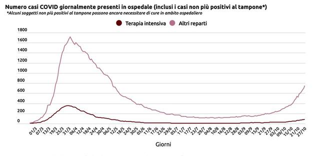 Numero casi Covid presenti giornalmente in ospedale (inclusi in non più positivi al tampone) - 28 ottobre 2020
