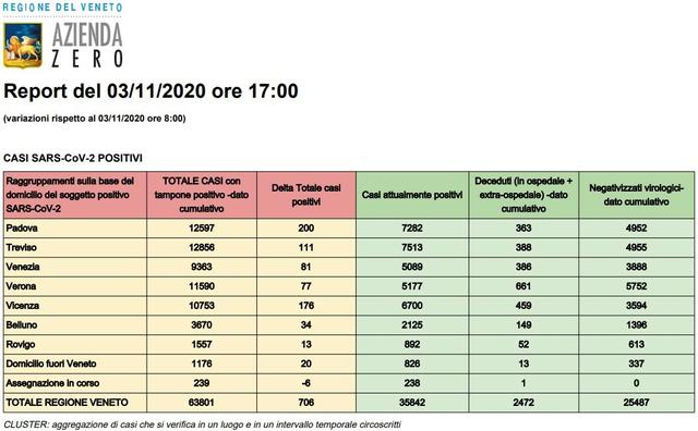 Stando all'aggiornamento di Azienda Zero, tra le ore 8 e le ore 17 del 3 novembre, sono 706 i nuovi casi emersi in regione, per un numero complessivo di 63801. Di questi 35842 sono attualmente positivi, 25487 sono negativizzati virologici, mentre i decessi di persone colpite dal virus, tra strutture ospedaliere e non, sono 2472, con il dato precedente che si era fermato a 2458.