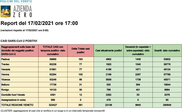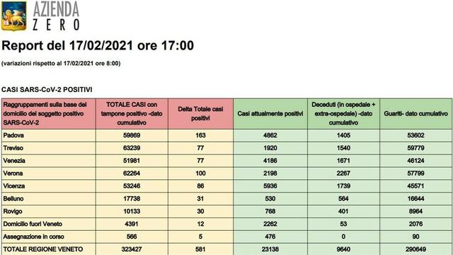 Sono 581 i nuovi tamponi positivi al Sars-CoV-2 registrati in Veneto dall'aggiornamento delle ore 17 del 17 febbraio di Azienda Zero, che indica anche altri 19 decessi, mentre si abbassano ancora i numeri relativi ai ricoveri (ma non nelle terapie intensive) e delle persone ora affette dal virus (ma non nel Veronese: 40 in più in 24 ore).