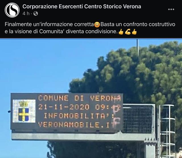 Ad ogni modo, soddisfatti del mutamento nella segnaletica luminosa parrebbero essere i commercianti della Coorporazione Esercenti Centro Storico Verona, i quali in una breve nota scrivono: «Dopo un significativo e propositivo confronto con il sindaco Sboarina, promosso da Confcommercio Verona che ringraziamo, speriamo in una giornata positiva per tutto il comparto del commercio, dei bar e dei ristoranti. Avanti tutta! Il Mantra deve essere: condivisione di intenti costruttivi a favore della città di Verona».