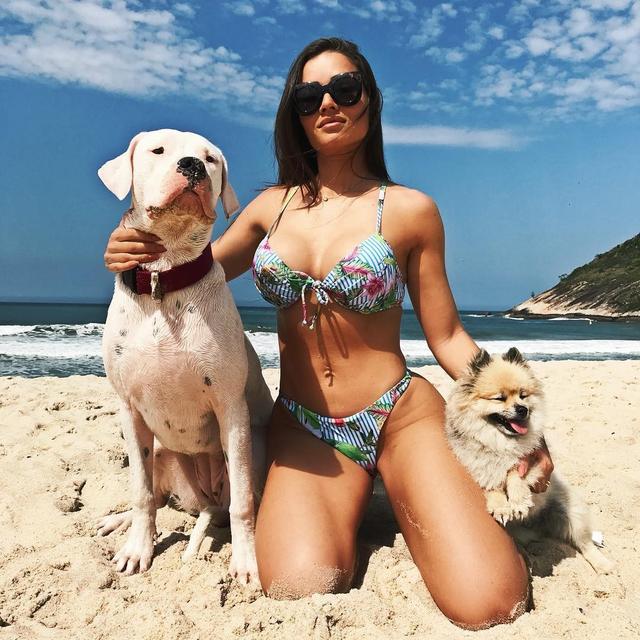 Aryane Steinkopf mostrou que apesar de viver atualmente fora dos holofotes segue com o mesmo corpão dos tempos de Panicat. No sábado (15), a (agora) morena aproveitou o dia de praia com os cachorros no Rio de Janeiro