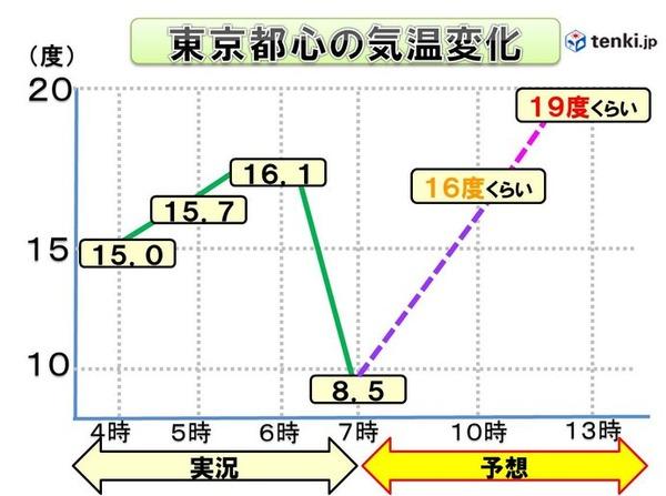 都心は午前6時に16度1分を観測しましたが午前7時に8度5分。日中は再び上がって最高気温は19度予想です。