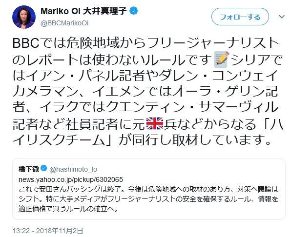 安田純平さんの件で日本のメディアが避けている論点をBBCレポーターの方が言及して下さっている。 危険地域の取材をフリージャーナリストに頼っている日本のメディアが「自己責任は是か非か」の二元論ばかり盛り上げるのは保身の為。 権力が権力を守る為に権力を行使する愚。 #nhk #ニュース7