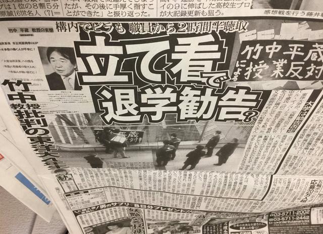 東洋大学で、同大教授の竹中平蔵氏を批判するビラを配った学生が咎められ、退学を示唆されたとされる問題。日刊スポーツ紙が大きく伝えている。2時間半に渡る事情聴取の中で、職員から「大学のイメージを下げているんだぞ!」と大声で言われた、と学生。イメージを下げているのはどちらか。