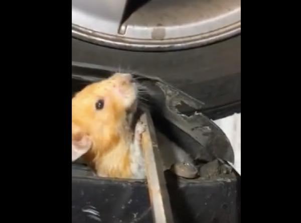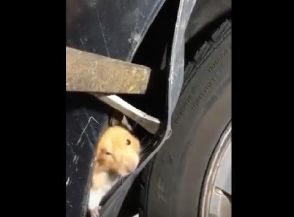 ハムスターが隠れていたのは、なんと車のフェンダー(タイヤを覆う泥除け部分)の内部だった!
