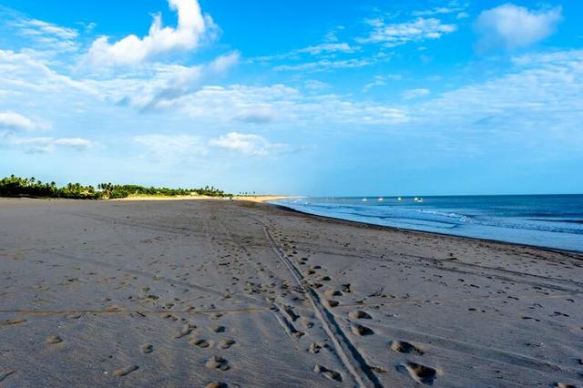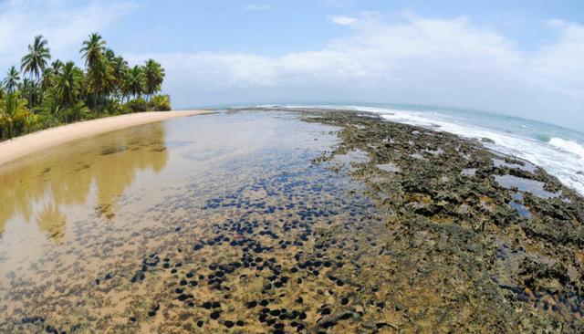 As belezas naturais da região incluem água verde-azulada, areia avermelhada, vegetação nativa, piscinas naturais e recifes de corais.