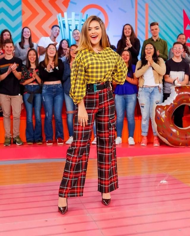 Para um look bem criativo, Maisa optou por combinar a mesma estampa em tons diferentes. A blusa xadrez com decote careca também era mais larguinha, dando volume por completo na parte de cima de sua produção.