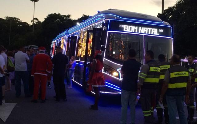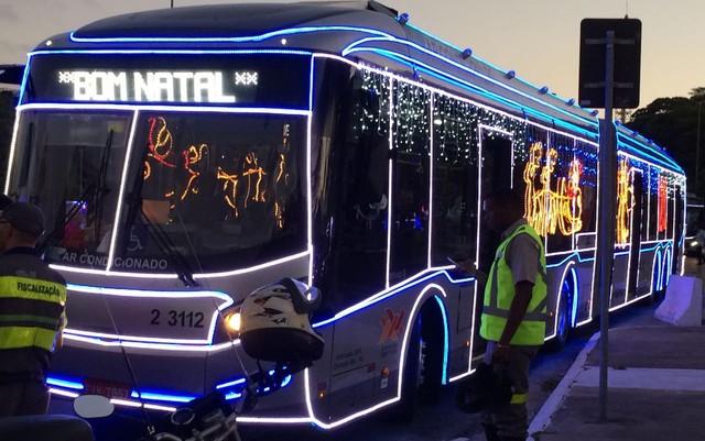 ônibus iluminados e decorados para o Natal começaram a circular na noite deste sábado (9) em São Paulo. Os motoristas dirigem vestidos de Papai Noel.