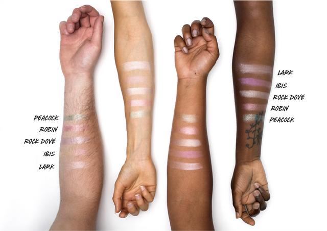 Better yet, the highlighters have been designed to be used anywhere you like including the cheeks, browbone, eyes, and even lips. The five colours are as follows; Rock Dove, which will will give you a lilac shimmer; Ibis, for those looking for a soft pink glow; Lark, which gives a silvery tone; Peacock for a much brighter blue-green shade; and Robin, which is a vibrant pink.
