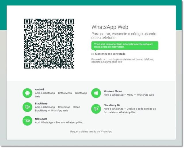 Em seguida, é preciso acessar o seguinte endereço para conseguir utilizar o mensageiro no PC: https://web.whatsapp.com/. Um código QR é exibido, assim como uma caixa de seleção para manter-se conectado e um breve tutorial para cada plataforma.