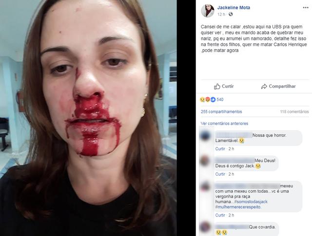 Na foto postada em seu perfil no Facebook, Jackeline está com o nariz inchado e com o rosto ensanguentado. A publicação recebeu centenas de reações e compartilhamentos.