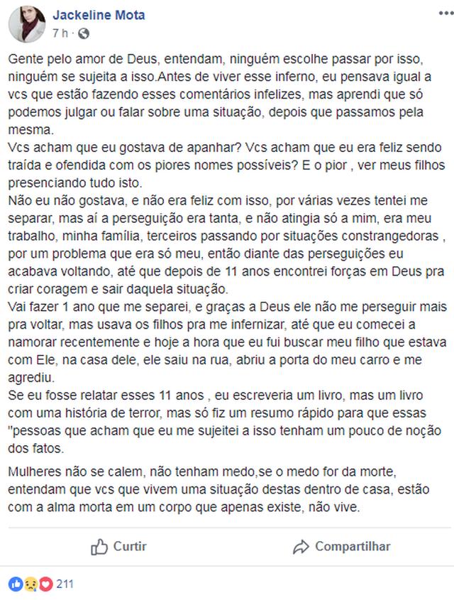 Quando perguntada sobre como conseguiu viver tanto tempo em um relacionamento abusivo, Jackeline desabafa: “Na verdade, eu não queria expor minha vida e não contava para ninguém. Aguentava tudo sozinha. Mas cansei de me calar.”