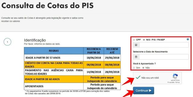 Passo 2. Informe seus dados pessoais para realizar a busca. Você pode utilizar seu CPF ou o número do NIS. Digite também sua data de nascimento, informe se já está aposentado ou não e preencha o captcha. Por fim, assinale o botão “Continuar”;