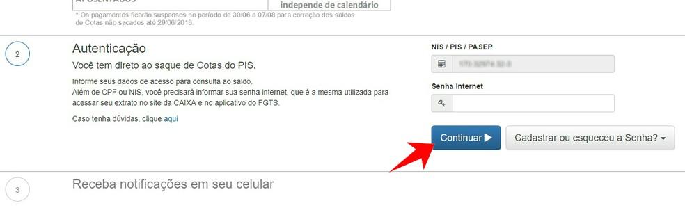 Passo 3. Informe sua Senha Internet, que é a mesma utilizada para consultar o extrato no site da Caixa ou no aplicativo para celular, e pressione "Continuar". Caso você não tenha a senha, aprenda como solicitá-la ao final deste tutorial;