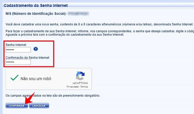 Passo 3. Na próxima tela, crie uma senha de seis a oito dígitos. Repita a mesma senha nos dois campos indicados. Preencha o captcha e selecione “Confirmar”;