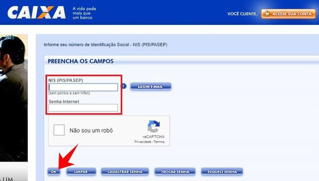 Passo 1. Acesse https://servicossociais.caixa.gov.br/internet.do?segmento=CIDADAO01. Digite seu NIS e sua Senha Internet, preencha o captcha e assinale “Ok”;