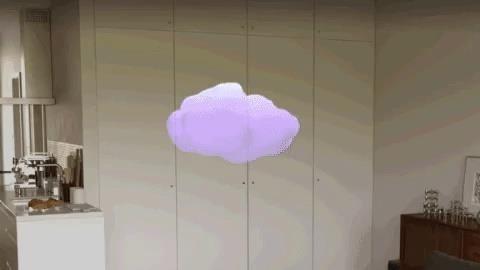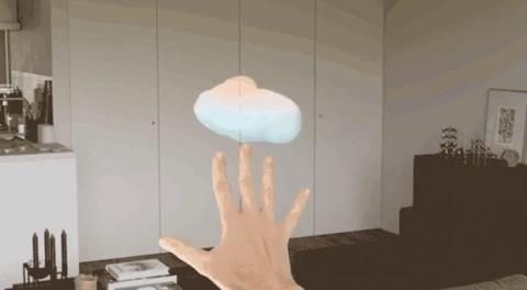In one animated image, a user conjures a cloud with a spawn gesture and, with a release gesture, causes the cloud to float upwards. In another animated image, with a blink of the eyes, the same cloud changes color. The lesson also acts as a means to demonstrate spatial audio based on the cloud's position relative to the user's point of view.