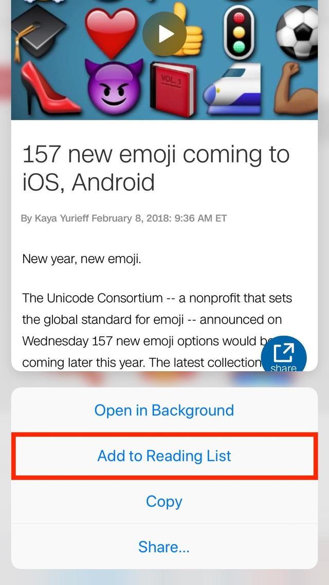 In an app like Mail or Notes, you can peek a URL using 3D Touch, then swipe up to find the "Add to Reading List" option. You can also just tap-and-hold the link to access the menu if you don't have 3D Touch. In an app like News, you can tap the share button, then tap "Add to Safari Reading List" in the activities row on the share sheet. For a link on Twitter, you can tap-and-hold on it, then select "Add to Reading List" from the activities row. And these are just a few examples!