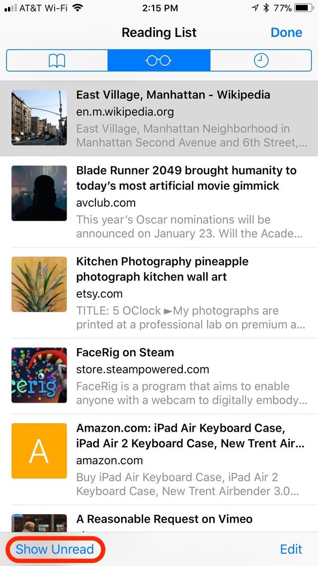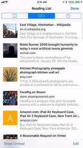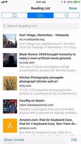 Once in your Reading List, you can scroll through the entries you have saved. Simply tap on any to jump to its webpage or peek first with 3D Touch to see a preview before popping into the site.