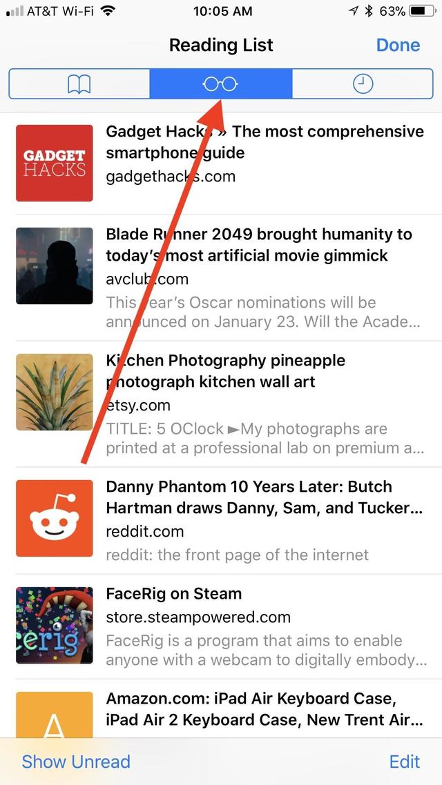 Once you've added at least one webpage to your Reading List, tap the book icon in Safari's menu bar. Then, tap the glasses icon towards from the options that pop up; This is the Reading List you have saved up.