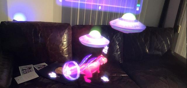 In the image above, you see somewhat familiar images that are drawn from Magic Leap's Create app. Shown in the photo are an array of virtual images including a jellyfish, flying saucers, and a dinosaur anchored to a couch.
