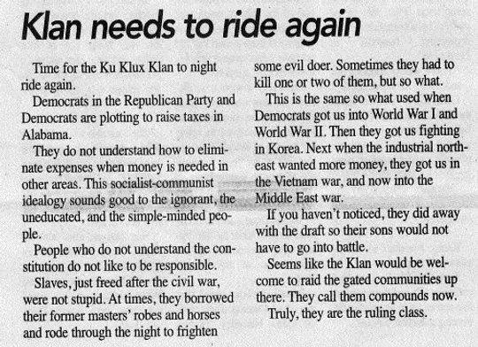 Just in case you needed more proof the simulation we live in is not being programmed by the most creative folks available, last week a small-town newspaper in Alabama, the Linden Democrat-Reporter, ran an editorial calling for the "Ku Klux Klan to night ride again" and do something about all the rich elitists, Democrats, and "Democrats in the Republican Party" who want to raise taxes in Alabama. And the paper's 80-year-old editor-owner is named "Goodloe Sutton."