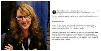“I just had a conversation with a new client...a frustrated professional who has a boss that thinks because his team is ‘working from home’ they should be available to answer his calls/emails day and night, and respond accordingly,” Robynn wrote. “My client is getting blasted with requests and his boss is getting pissed when he is not answering within five minutes.”