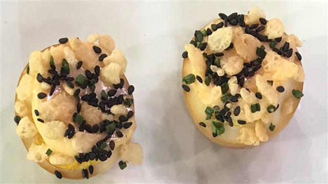 3. Trim ends off eggs and then cut in half so they stand upright. Garnish with black sesame seeds, Rice Krispies and chili oil.