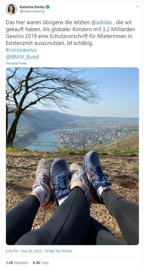 Some senior politicians went even further, suggesting a boycott of the brand. Former German justice minister and now a member of the European Parliament, Katarina Barley, posted a picture of her Adidas shoes on Twitter, suggesting that these were the last she would be buying. “A global company with turnover of 3.2 billion exploiting protective regulations meant for tenants, whose livelihoods are threatened, is shabby,” Barley wrote under the picture. Later, she added: “if the damage done to their image is worse than making some short-term economies, maybe a few managers will think twice.”