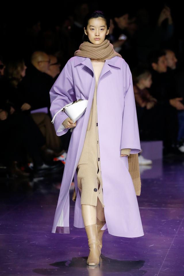 The tone was set from the first look at the venue: a lilac carpeted music hall in which guests sipped matching mauve smoothies while waiting for the show to start. Models walked out to a live string orchestra wearing a precise curation of colors to complement the traditional black, navy and gray Boss looks. Lilac, a daring tone for men’s wear, looked particularly good on masculine suits, while the hue freshened up an oversized duster coat and snuggly knitted polo neck jumper for women. Rust tones brought warmth to leather coats and trousers for men, as did pops of orange on parkas and faux-fur coats.