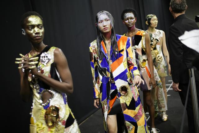 As befit Risso’s rabbit-hole sojourn, an otherworldly aura took hold. With their faces glittered and their hair in matted-down waves, his models worked a she-warrior vibe that owed a debt to Sarah Burton, only more ethereal than earthy. They wore A-line dresses and coats in various states of patchwork. Some appeared as random collages while others were simpler, with a single contrasting fabric panel spliced into one side of a dress. Throughout, leathers and canvas imbued the collection with a utilitarian grit, but it was countered by the deft juxtaposition of flashy metallics and gentle velvets. Giant, rugged cardigans also showed the artisan’s hand, assemblages of various sweater knits, whip-stitched together. Yet the collection was not without refinement, delivered via exquisite brocades and tapestries that Risso said came from a Venetian supplier that uses looms designed by – get this – Leonardo da Vinci.
