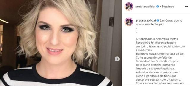 "Sarí Cortês, que você nunca mais tenha paz", escreve Preta Rara em sua conta no Instagram | Foto: reprodução/Instagram