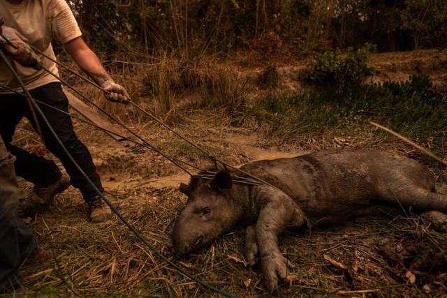 Biologo restatando anta de incêndio no Pantanal (Photo by Gustavo Basso/NurPhoto via Getty Images)