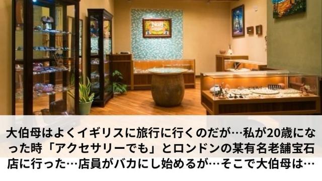 店員たちの話をすべてわかっていた大伯母はキャハハと笑っている店員に「貴女たちは私が東洋人だからそう言うの?それともこんな年寄りだから?イギリス人の私よりおばあちゃんが来たらどんな対応するの?」と聞いた。