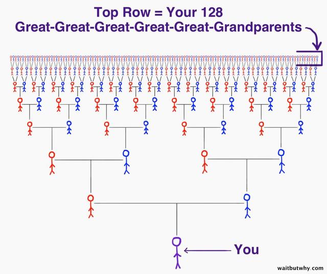 Though it seems obvious, your family tree doesn’t end at your great-grandparents, or even your great-great-great-great-grandparents. Everyone is the result of an unknowable number of couplings across millions of years, and trying to trace it all the way back is basically impossible.